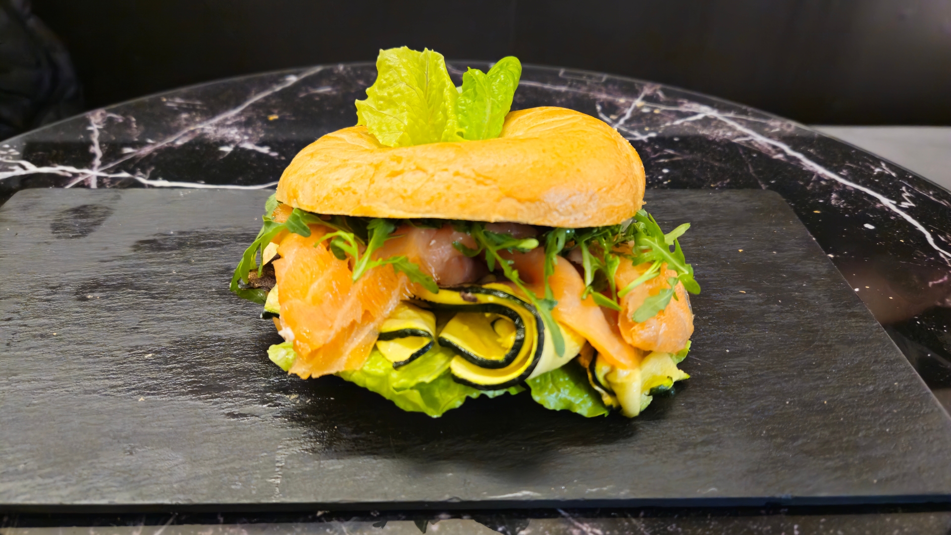 Bagel con Semi di Papavero, Salmone Affumicato, Zucchine Grigliate, Rucola e Senape al Miele